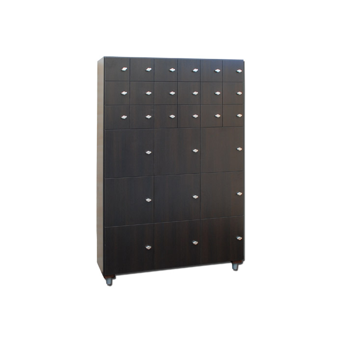 Safe Deposit Box available in the 18+9-seat version. Structure in 100% fir melamine and 18mm thickness. Dimensions of the structure 184,5X123,6X30 cm, module 18x20x20 + module 9x40x40 . Compartment size 831x1034x250mm. 1.2mm thick ABS edging. Lock in chromed steel with padlockable mechanism or with key. Structural support in solid wood with a thickness of 3.3cm able to withstand all the stresses of the structure. Support foot in polypropylene. Wenge base color, further colors are available on request.