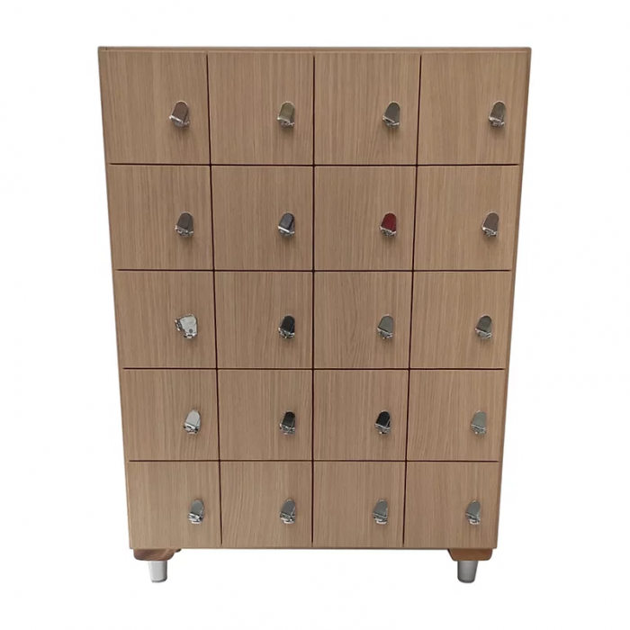 Safe Deposit Box available in the 20-seat version. Structure in 100% fir melamine and 18mm thickness. Dimensions of the structure 103.4x83x25 cm, module 20x20. Compartment size 831x1034x250mm. 1.2mm thick ABS edging. Lock in chromed steel with padlockable mechanism or with key. Structural support in solid wood with a thickness of 3.3cm able to withstand all the stresses of the structure. Support foot in polypropylene. Wenge base color, further colors are available on request.