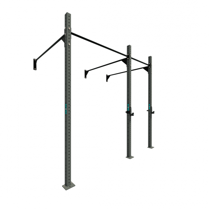 Il Ring a due stazioni serie WOD con fissaggio a parete è dotato di 5 pull-up station (1 a 106 cm e 4 a 168 cm) e 1 squat station.